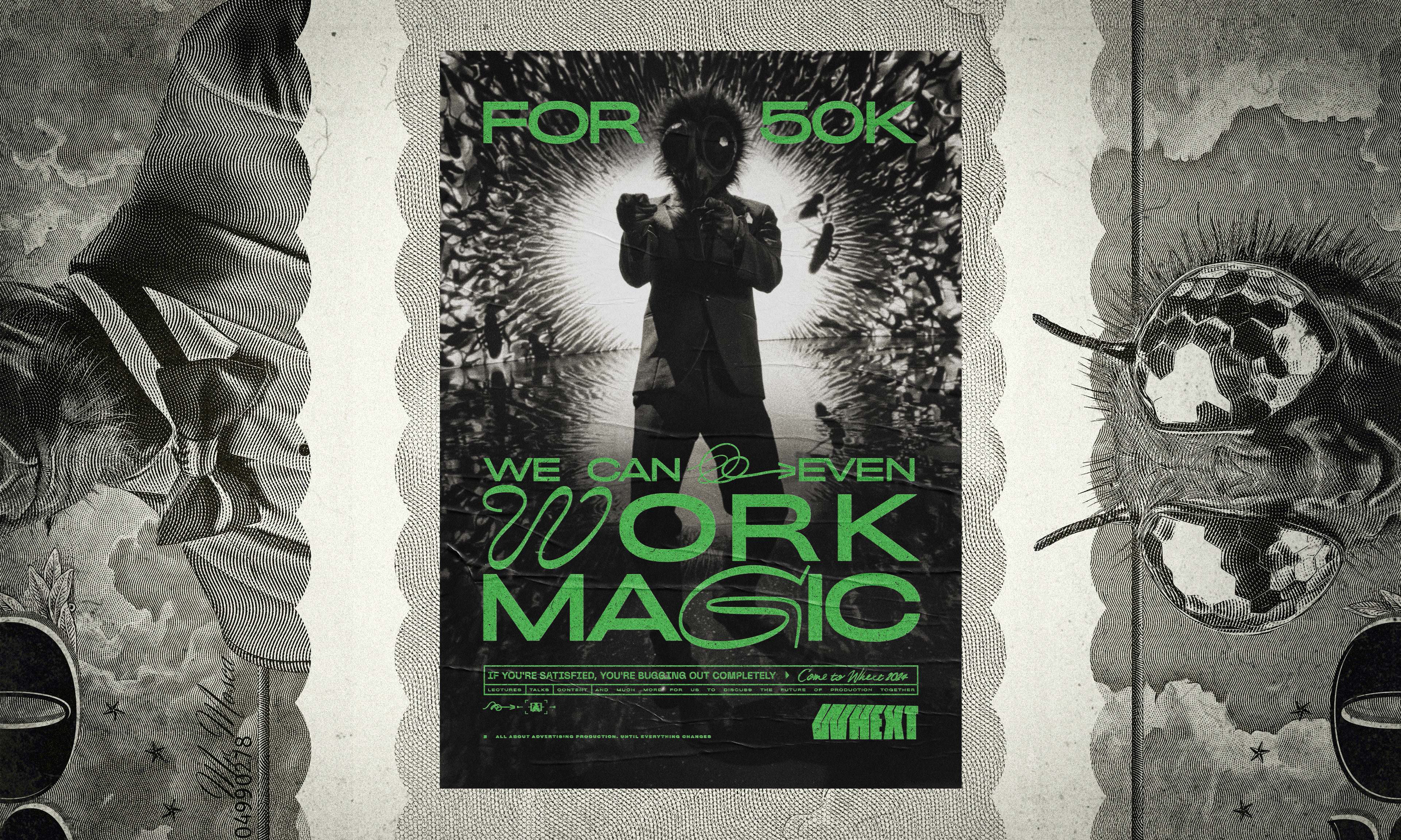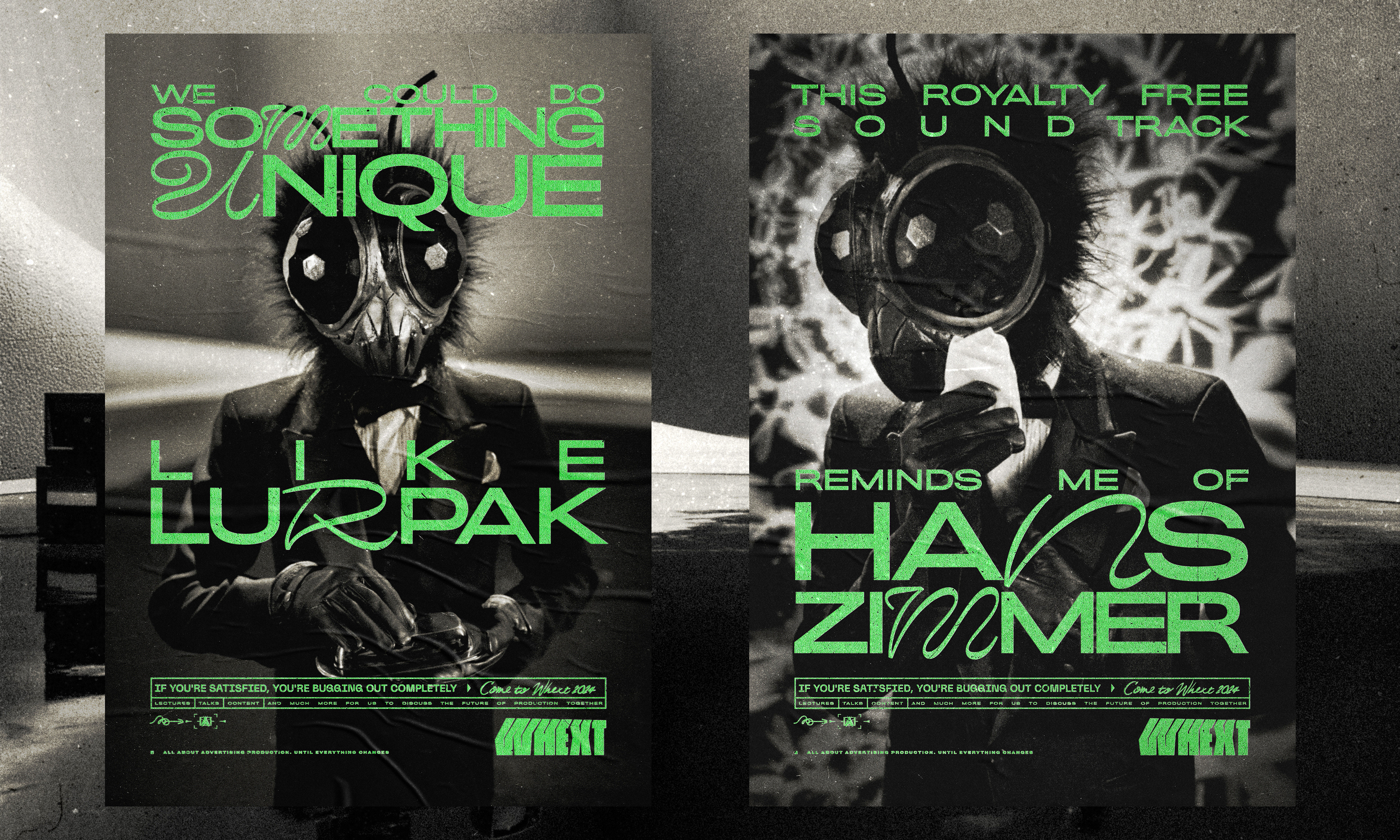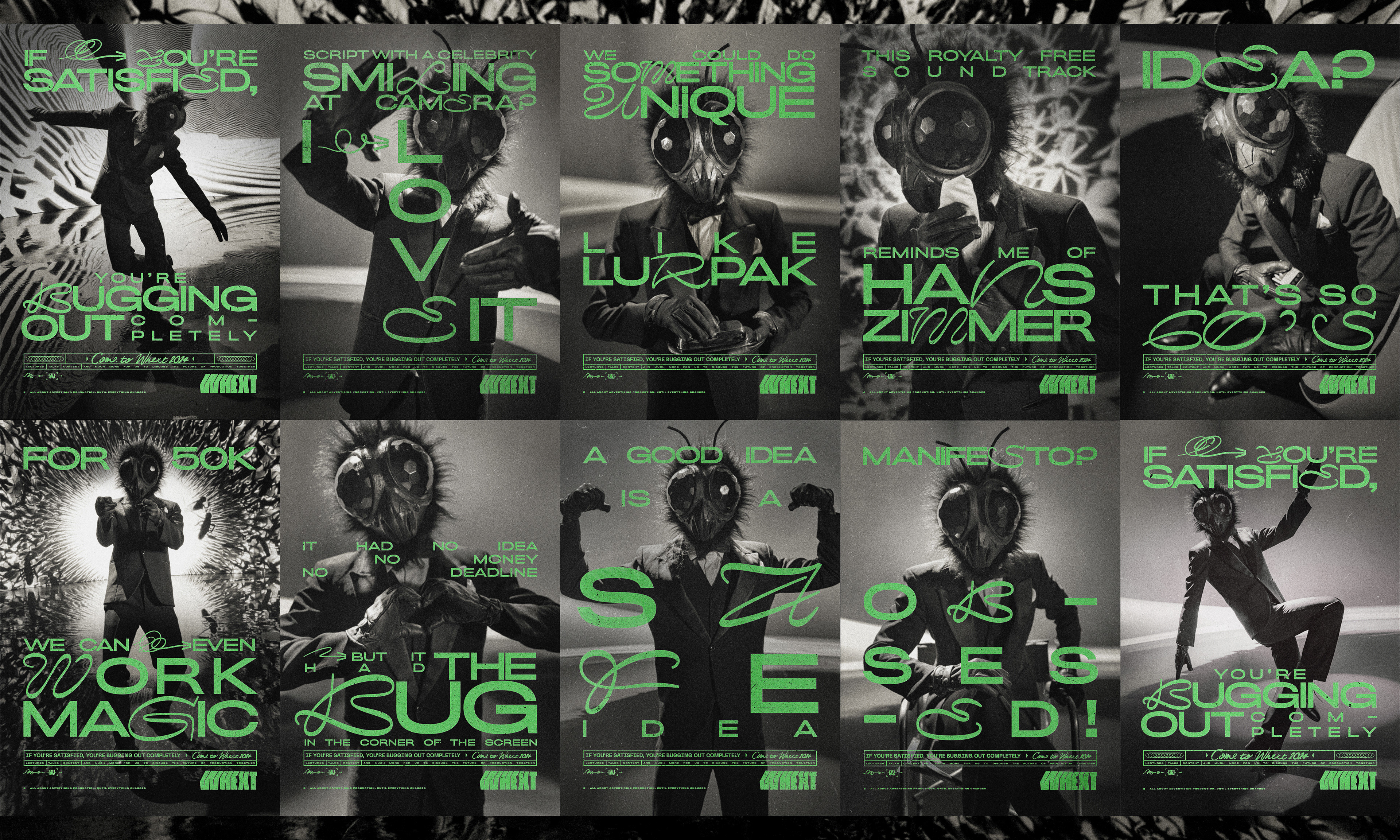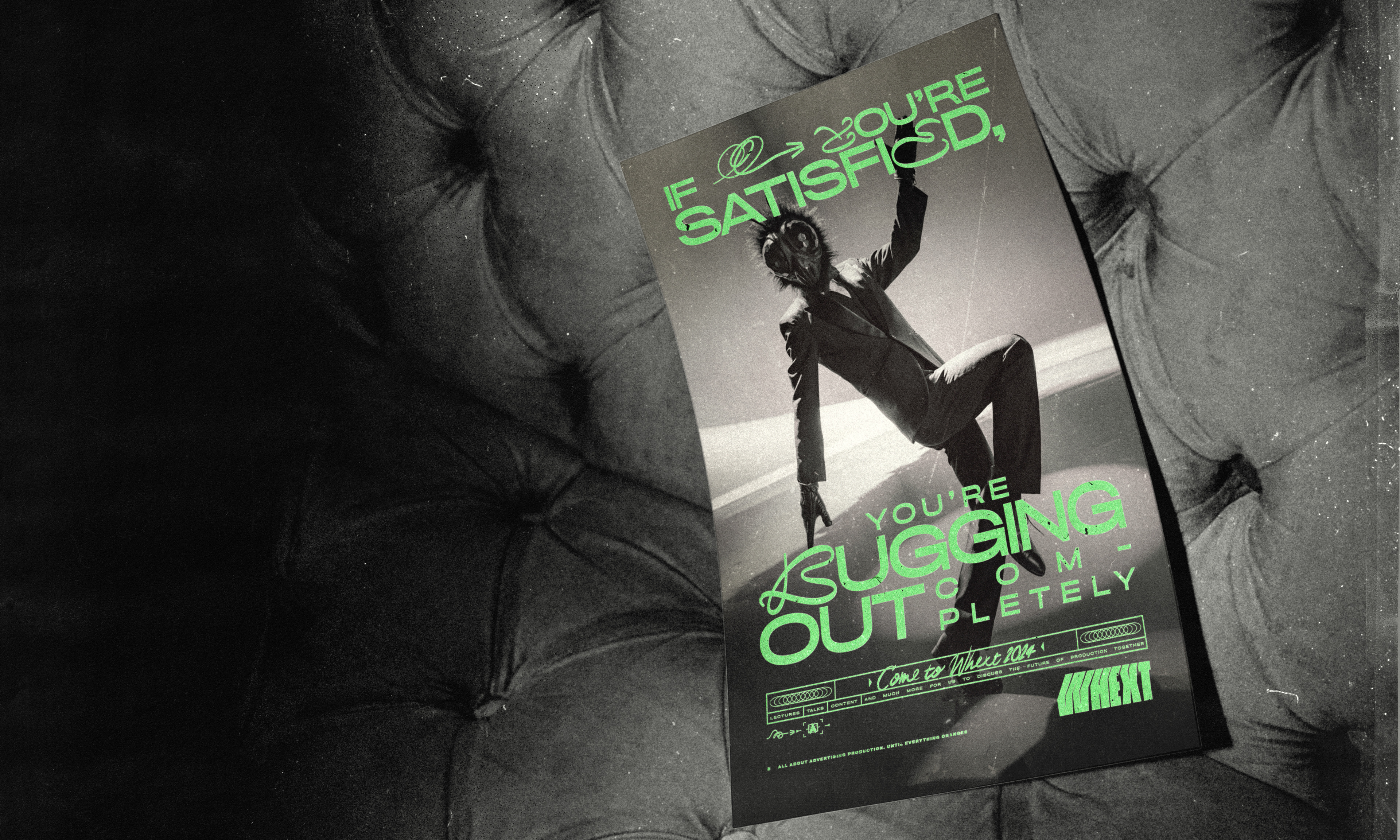 Whext is a space for honest conversations, with talks, panels, and content designed to do one thing: push the quality of our industry forward. Under the bold concept “If you’re satisfied, you’re bugging out completely,” we developed a full campaign: film, identity, content, and more.